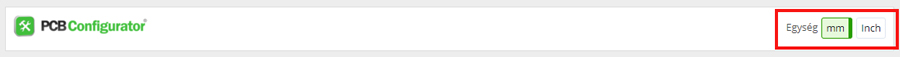 A PCB konfigurátor címsorában választható ki a mértékegység, amely mm (alapértelmezett) vagy hüvelyk (inch) lehet. Amennyiben töltött fel dokumentációt, abban az esetben a mértékegység a megadott adatformátum alapján kerül kiválasztásra.