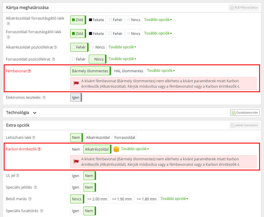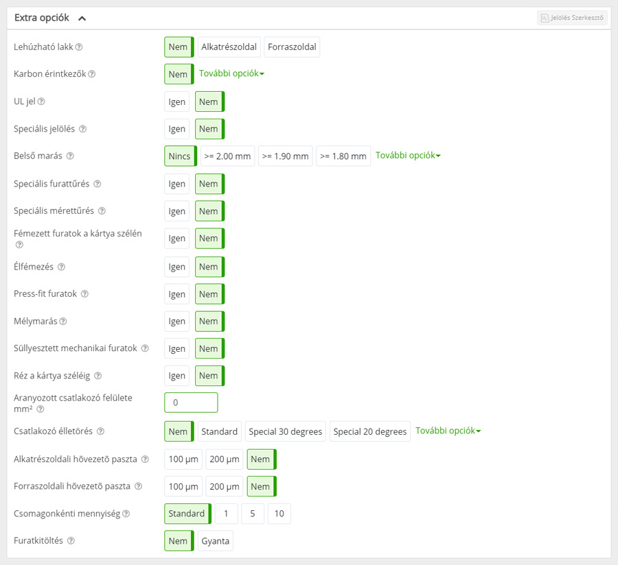 Az Extra opciók szekció lehetővé teszi, hogy a PCB gyártása során alkalmazandó további opciók közül válasszon.