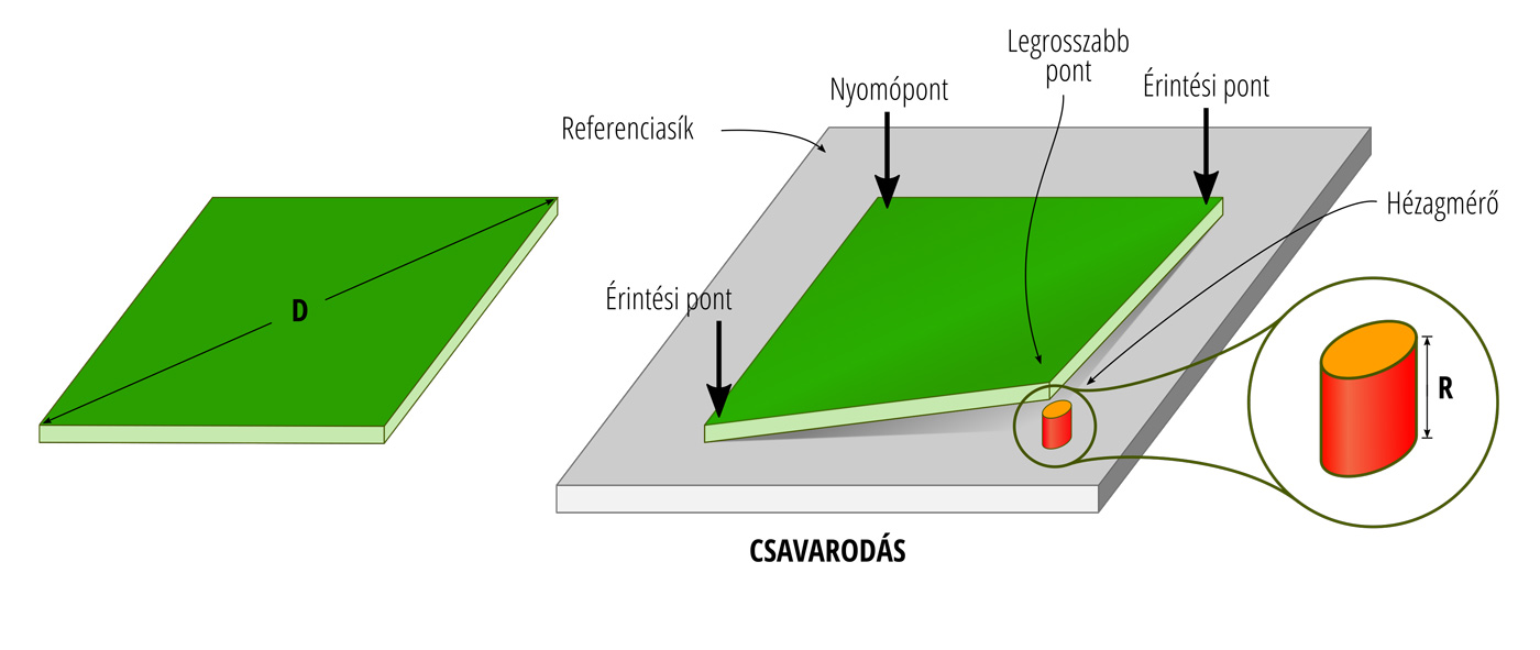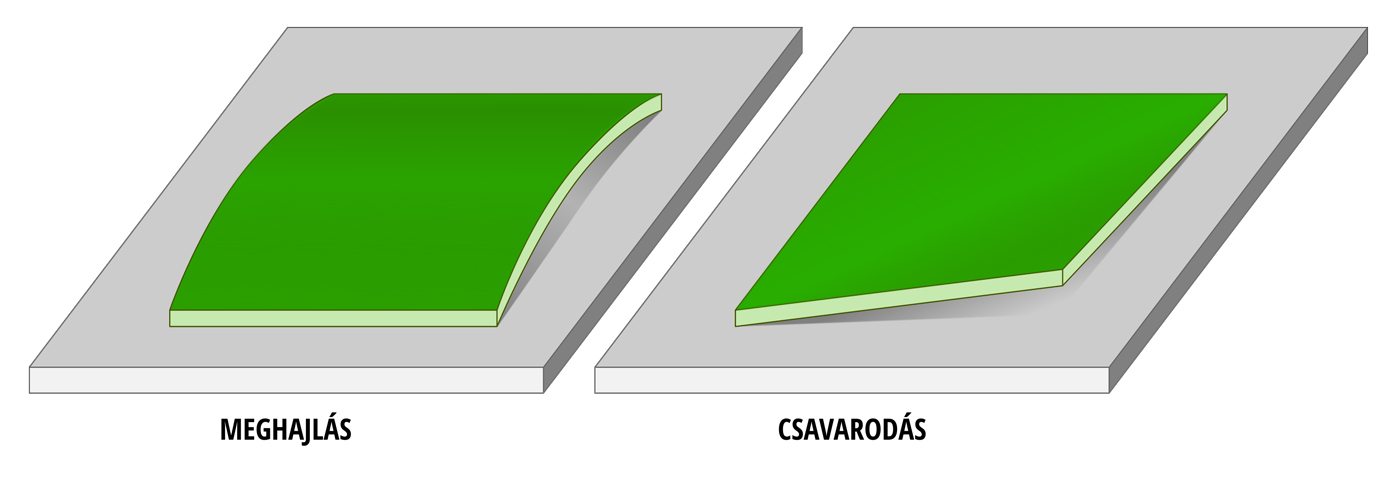 Csavarodás: A nyomtatott áramköri lap olyan deformációja, amely egy átlóval párhuzamosan történik a felületén keresztül, miközben a lap egyik sarka nem abban a síkban van, amely a másik három sarkot magában foglalja, amennyiben a termék téglalap alakú.