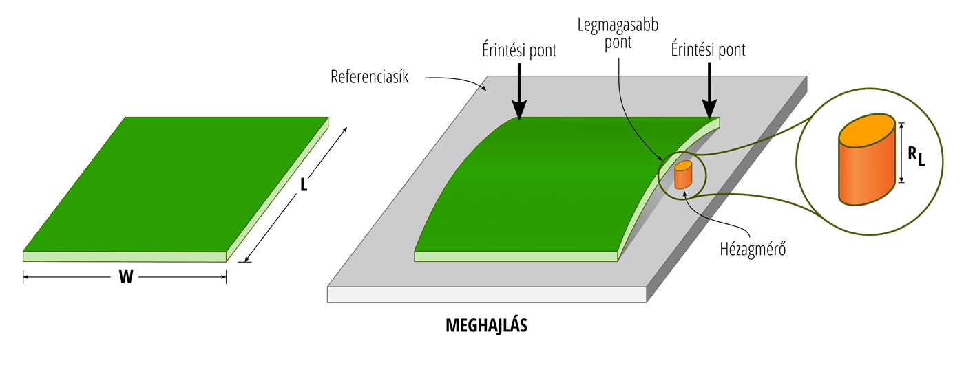 Meghajlás: A nyomtatott áramköri lap síkjától való eltérés, amelyet megközelítőleg hengeres vagy gömb alakú görbület jellemez, miközben négy sarka egy síkban van, amennyiben a termék téglalap alakú.