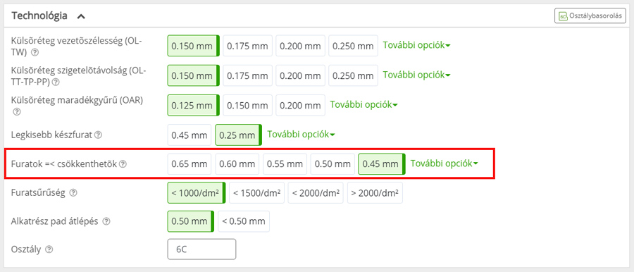 Az átvezető furatok alapértelmezett értékét a PCB konfigurátor – Technológia részében a Furatok =< csökkenthetõk paraméter módosításával változtathatja.