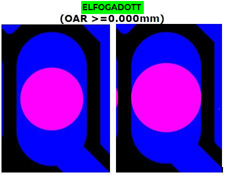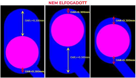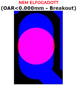 - A hosszúkás padek keskenyebb részén a lentiek szerinti >= 0.00 mm (0 mil) maradékgyűrű szükséges. (A furat nem nyúlthat túl a paden.)