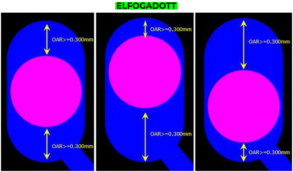 - A hosszúkás padek hosszanti részén a lentiek szerinti >= 0.30 mm (12 mil) maradékgyűrű szükséges a pad mindkét irányában. (A furat csak a pad középvonalán mozoghat, merőlegesen nem mozdulhat el.)
