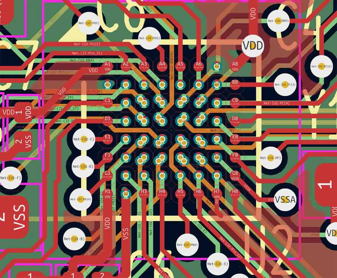 Ezután nézzük meg magát a tervet, amelyet az 5. ábra mutat be. Középen a 0.4 mm osztású BGA látható, körülötte különböző más alkatrészekkel. A BGA részletesebb nézete a 6. ábrán tekinthető meg. Kérjük, hogy a cikk hátralévő részében használja referenciaként ezeket a képeket.