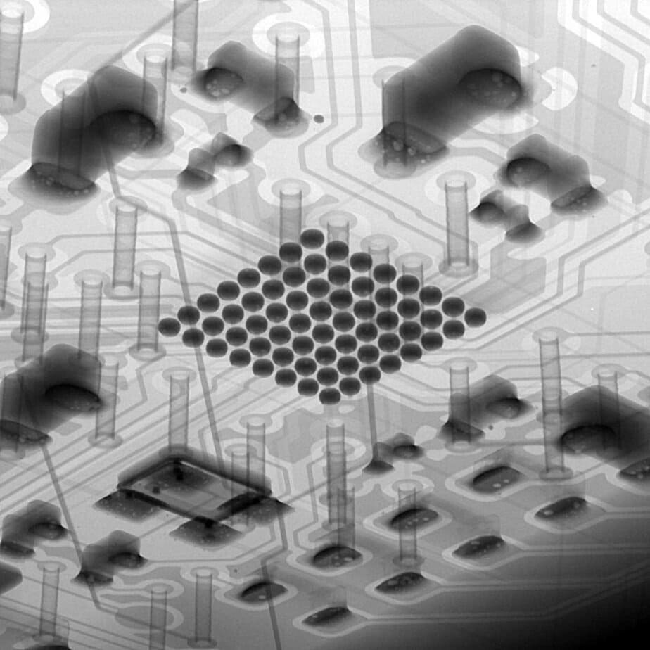 9. ábra. Röntgenfelvétel a BGA forrasztása után. A forraszgömbök nagyobbak, mint a 7. ábrán láthatóak, és nem mutatják az általunk keresett hibák egyikét sem, mint például zárlat, illesztési pontatlanság vagy nem megfelelő forrasztási kötés.