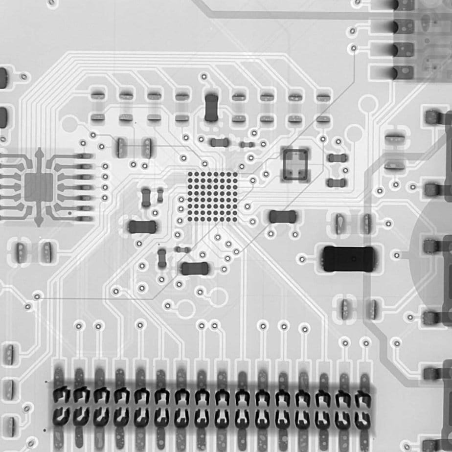 7. ábra. A PCB röntgenképe a forraszpaszta felvitelét követően. Megfigyelhető, hogy a padek alatti apró mikroviák mennyivel kisebbek a hagyományos átvezető furatokhoz képest.
