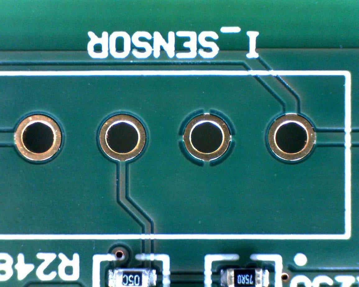 Pinholes are tiny holes in what otherwise looks like a solid plain; this is often caused by design tools approximating solid shapes, like a fill, with stroked segments or polygons. As with peelables, these pinholes can cause issues when tiny dry film pieces that cover them detach, float, and reattach elsewhere on the panel. We look for and fix pinholes by ‘filling’ them with copper in the design files. And, as before, hatched patterns have the potential of creating many such pinholes instead of the occasional few with a solid fill.