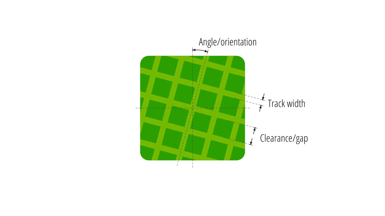 A basic hatched pattern has three properties: track width, clearance/gap, and an angle/orientation.