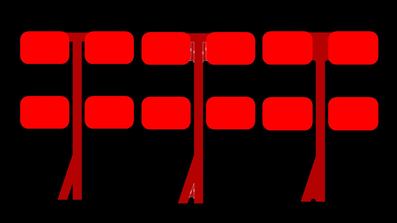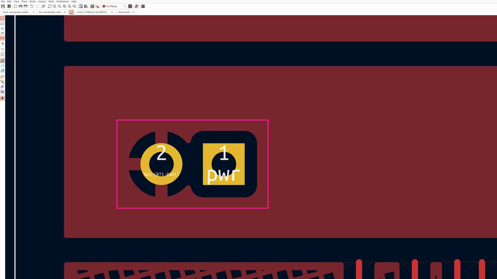 An example of a solid fill where there’s a thermal relief at the hole connected to the fill’s net (third from the left) and tracks going into or out of the holes that aren’t connected to that net.
