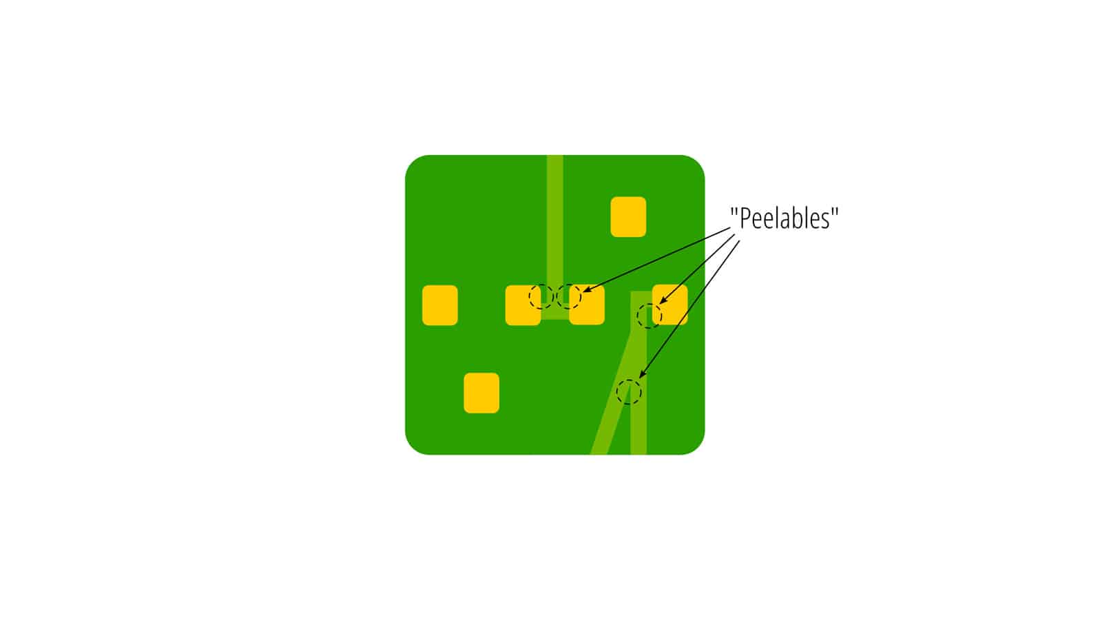 ‘Peelables’ are tiny gaps caused by same-net connections that may cause dry film slivers to fall off and reattach themselves elsewhere and create shorts.