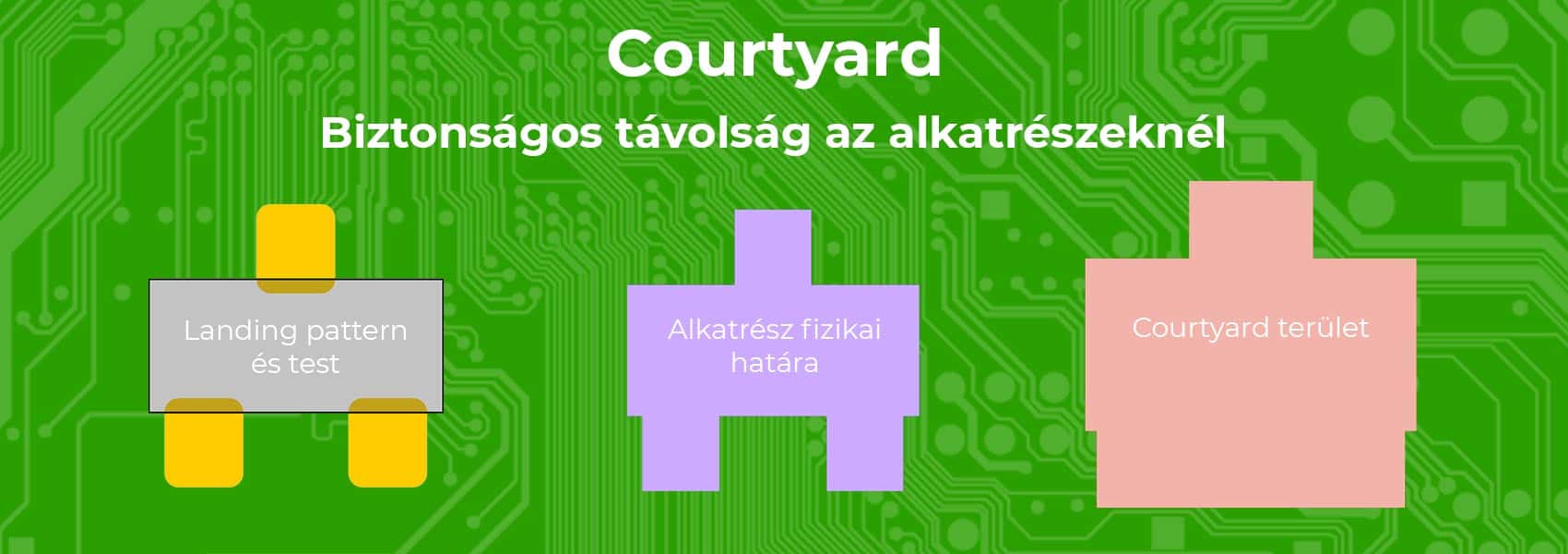 A courtyard egy virtuális terület, amelyet egy alkatrész fizikai körvonalától bizonyos távolságban határozunk meg. Az alkatrész szintjén kerül létrehozásra a láblenyomat (footprint) meghatározásának részeként, és arra szolgál, hogy megmondja a tervezőeszközeinknek, hogy hová nem léphet be más courtyard.