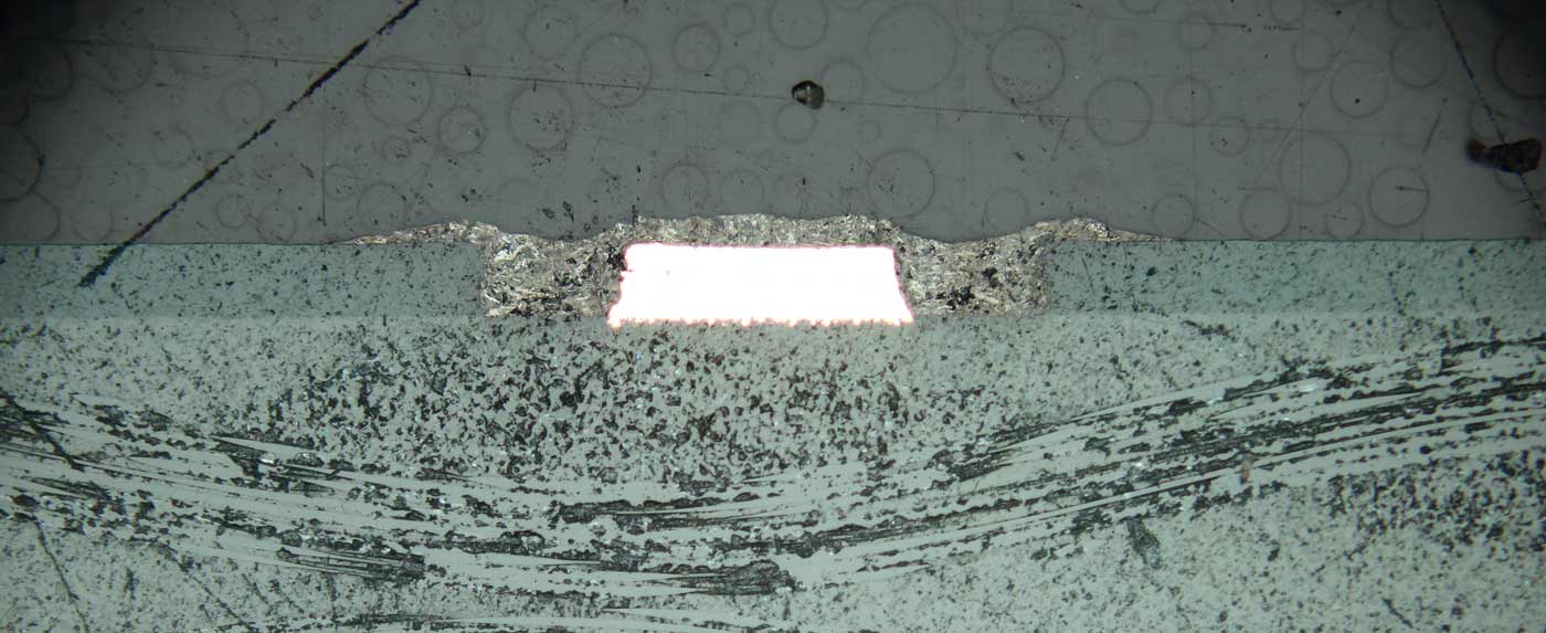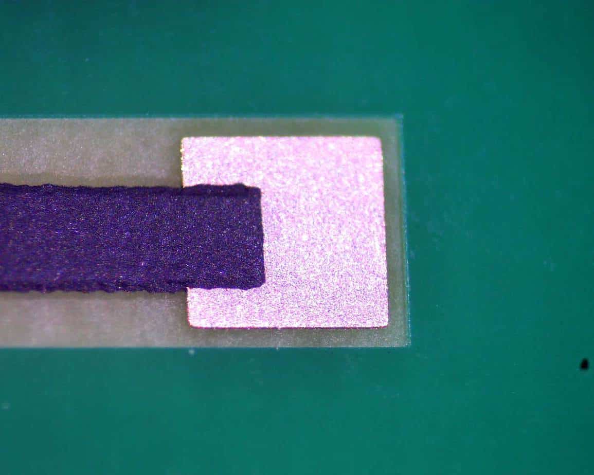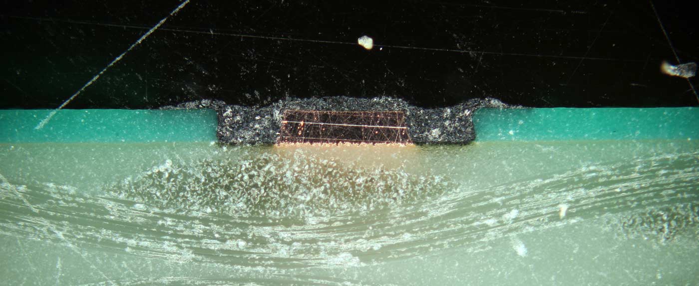 Cross section of PCBs that have had carbon ink applied to copper pads with soldermask overlap.