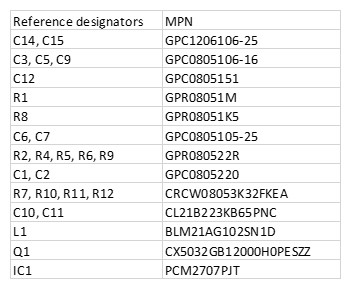 Az Eurocircuits generikus alkatrészeket elektromos paramétereik határozzák meg, ezért a gyártói cikkszám (MPN) helyett érdemes a standard passzív és elektromechanikus alkatrészeket elektromos paramétereik és/vagy az Eurocircuits saját generikus cikkszáma (GPN) alapján meghatározni a BOM-ban.