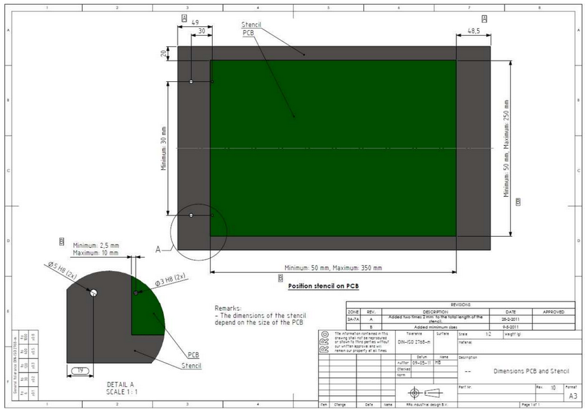 The eC Registration System is a simple, easy to use, yet accurate pin tooling system to perfectly register the SMD stencil onto the PCB (panel). Stencils having this tooling are called eC- stencils. PCBs having these tooling are called eC-Registration Compatible PCB’s. The PCB requires 2 location holes of 3 mm finished diameter and the stencil requires 2 location holes of 5 mm finished diameter. The drawing shows their relative positions and should be sufficient for PCB and stencil manufacturing. All dimensions are shown on the drawing. Stencils having this tooling are called eC- stencils. PCBs having these tooling are called eC-Registration Compatible PCB’s. Please note that: